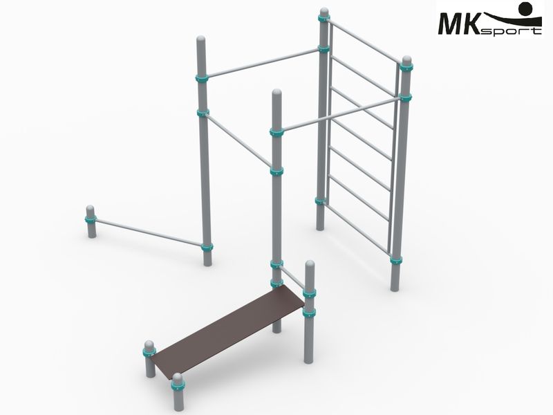 Воркаут-комплекс состоит из 4 разных по функционалу снарядов: разноуровневых турников, шведской стенки, упора для отжиманий и наклонной лавки для пресса. Основные столбы изготовлены из стальных труб 89*3 мм. Турники, перекладины и шведская стенка выполнены из труб 32*3 мм. Материал скамьи для пресса – влагостойкая ламинированная фанера на металлокаркасе. Фиксация снарядов к опорным столбам осуществляется с помощью стальных хомутов. Стандартный цвет комплекса серый, хомуты бирюзовые.