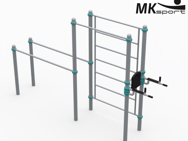 Ширина спортивного комплекса не превышает 70 см, а его длина около 4 м. Столь компактные размеры данного воркаут-комплекса позволяют отлично вписать его даже в самые небольшие спортивные площадки и тесные дворы. Однако несмотря на свою компактность, оборудование обладает достаточно широким функционалом. В комплекс входят 4 снаряда: параллельные брусья, турник, шведская стенка и упор для пресса и отжиманий. Опорные столбы выполнены из стальных труб 89*3 мм, перекладины, шведская стенка и турник из труб 32*3 мм. Брусья изготовлены из труб 42*3 мм. Спинка и подлокотники пластиковые. Основной цвет изделия серый, хомуты бирюзовые.