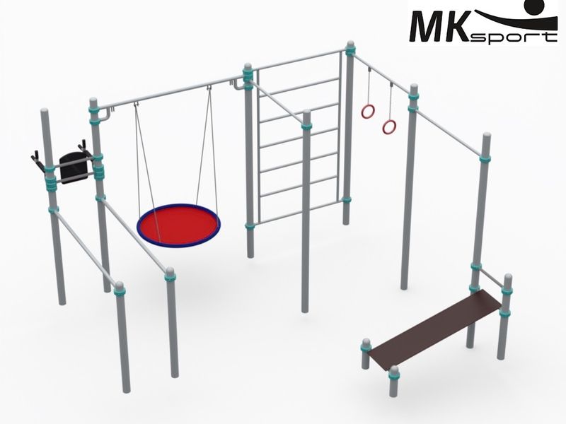 Многофункциональный, но в то же время весьма компактный воркаут-комплекс отлично подойдет для обустройства спортивных площадок, стадионов и дворов. Он сочетает в себе элементы спортивного оборудования и развлечений. Комплекс состоит из брусьев, упора для пресса и отжиманий, перекладины для качелей, шведской стенки, колец, турников и лавки для пресса. Опорные столбы изготовлены из стальных труб 89*3 мм, перекладины турников и шведской стенки из труб 32*3 мм, перекладина для качелей из трубы 42*3 мм. Материал спинки и подлокотников – пластик, скамья выполнена из влагостойкой ламинированной фанеры. Кольца алюминиевые (нержавеющая сталь).